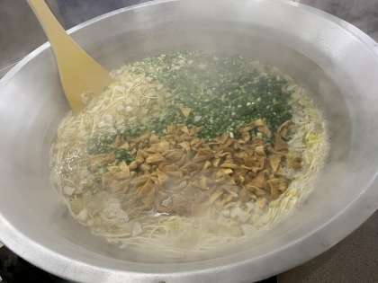 三角形に切って、甘辛く煮たうすあげ・かまぼこ・はくさい・青ネギが入ったうどんにとろろこんぶを入れて食べます。