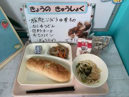 豚肉とごぼうの煮もの、なにわうどん、とろろこんぶ、固形チーズ、おさつパン、牛乳