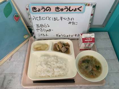 豚肉と干しずいきのみそ煮、五目汁、焼きじゃが、ごはん、牛乳