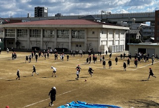 日差しが暖かいので、たくさんの児童が運動場で遊んでいます(あわせてドッヂボール大会も行われています)