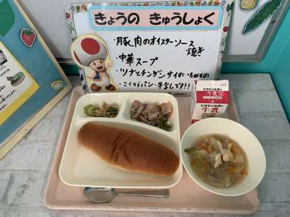豚肉のオイスターソース焼き、中華スープ、ツナとチンゲンサイのいためもの、黒糖パン、牛乳