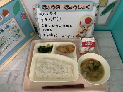 たらフライ、うすくず汁、こまつなのごまあえ、ごはん、牛乳