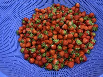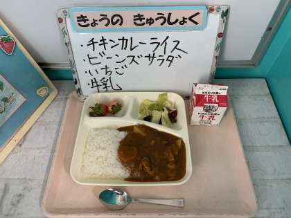 チキンカレーライス、ビーンズサラダ、いちご、牛乳