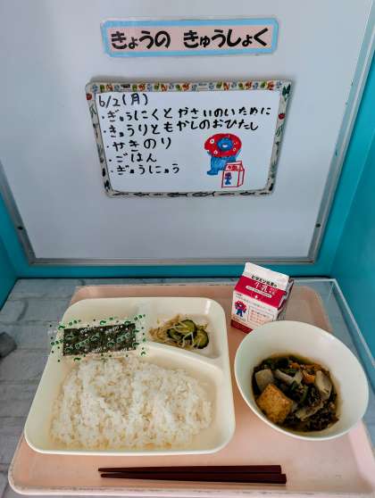牛肉と野菜のいため煮、きゅうりともやしのおひたし、