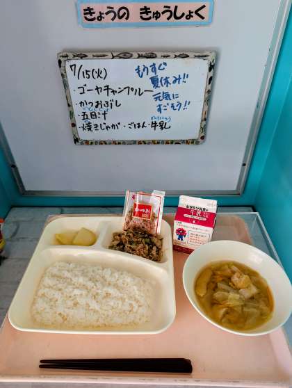 今日の給食は、ビタミンCが多いゴーヤ(にがうり)を