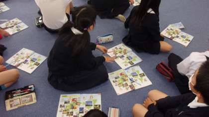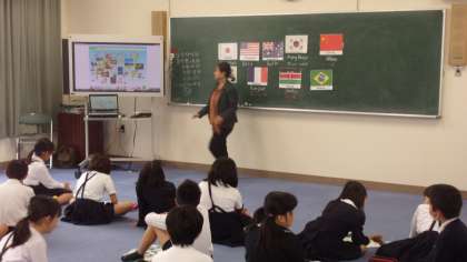 5年生は世界のあいさつの言葉を、映像を見ながら、英語で話すという内容で、学習していました。あいさつの言葉、覚えられたかな?