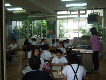 5年2組は、社会の自然条件と人々のくらしの学習をしました。ひとりずつ沖縄について知っていることを発表しました。