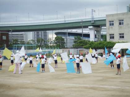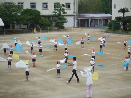 2年生は、カラフルな旗を一生懸命振って、ダンスの練習をがんばりました。