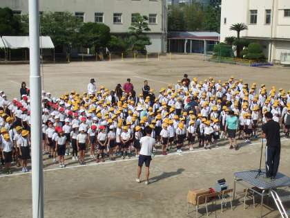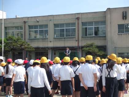 昨夜の雨があがり、晴天のなか全校朝会が運動場でおこなわれました。