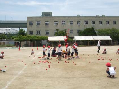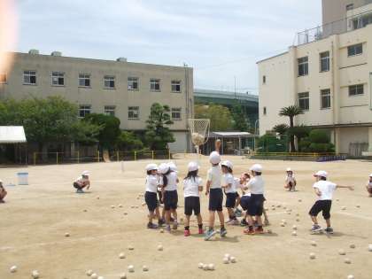 みんなで頑張って、高さのあるかごめがけて玉を投げました!