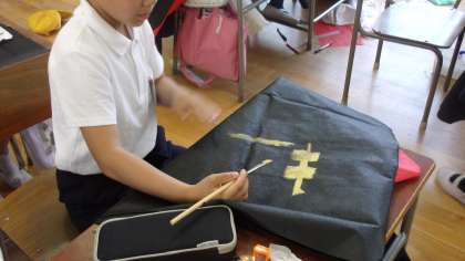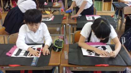 「ソーラン節」の衣装づくりをしています。お気に入りの1文字を、「はっぴ」の背中に書いて、色づけします。