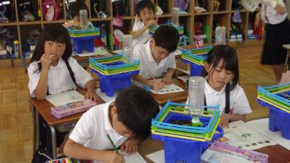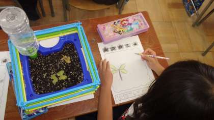 1年生が、芽を出した「あさがお」の様子を絵にかいていました。