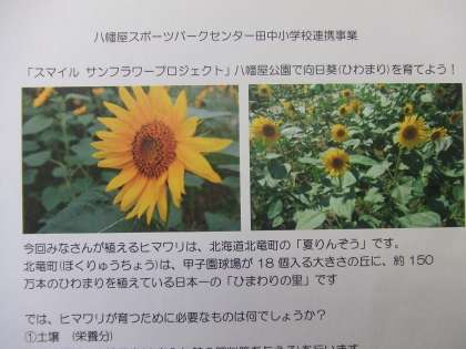 田中小学校は、本年度も八幡屋スポーツパークセンターさんと共同で様々な企画を進めていきます。その一環として、5年生が八幡屋公園の花壇にひまわりの苗を植え育てます。このひまわりの種は、日本一のひまわりの町、北海道の北竜町から「夏りんそう」という種類のたねをいただきました。このホームページで、ひまわりの様子は随時お知らせしていきます。