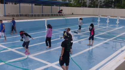 教職員でプールの清掃をしました。いよいよ来週からプール水泳が始まります。今日から水をためて、準備します。