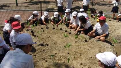 八幡屋スポーツパークの方が、苗を育てていただいたものをみんなで丁寧に植えました。