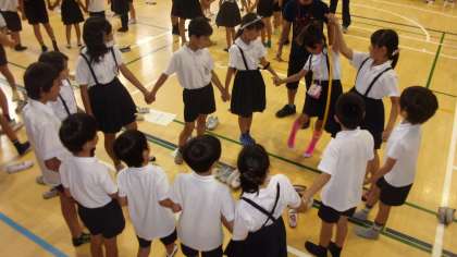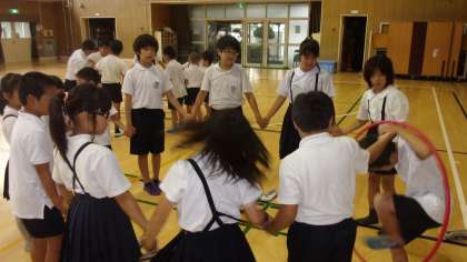 今日は、Aチームが講堂で、「フラフープくぐり」というゲームをしました。グループで手をつないで、フラフープを順に何周くぐれるかを競うゲームでした。4周以上のチームがいましたよ。