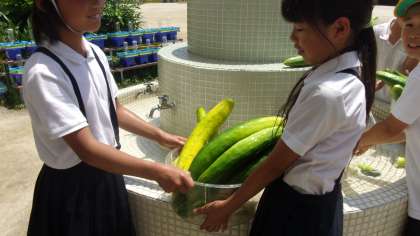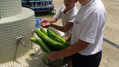 5年生が育てている「きゅうり」が大きく成長して、いっぱいとれました。