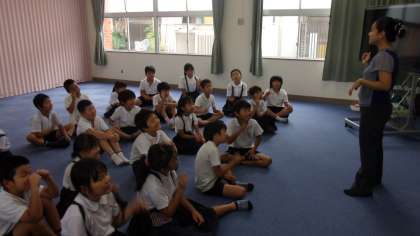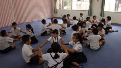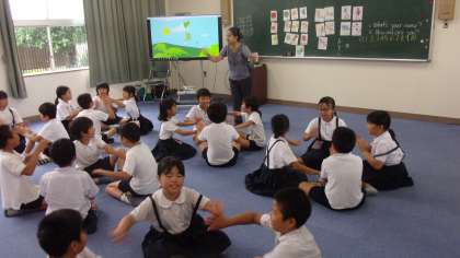数と年齢、名前、○○が好きですか?などを英語で言い合っています。