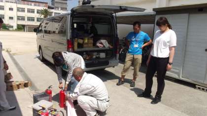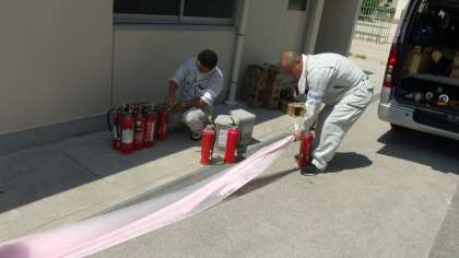 今日は消火器を取り換えるので、古くなったものを使って、練習しました。