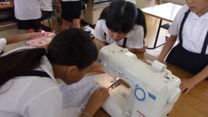 5年生がミシンを使って、「エプロン作り」をしていました。