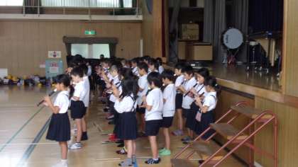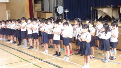 3年生が敬老会に向けて、「呼びかけ」と合奏の練習をしています。
