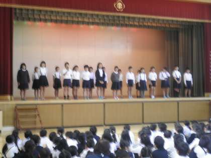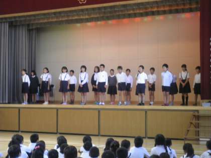 朝の児童集会で、後期の児童会代表委員会の児童の紹介がありました。