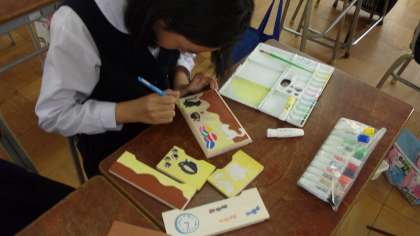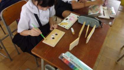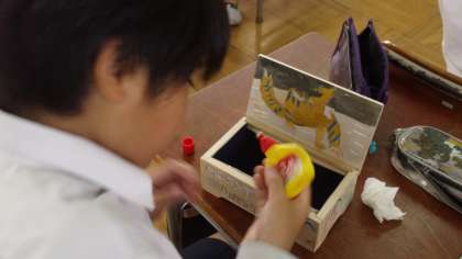 箱には、色を塗った後、さらにニスを塗ってつやをだします。