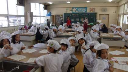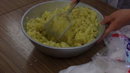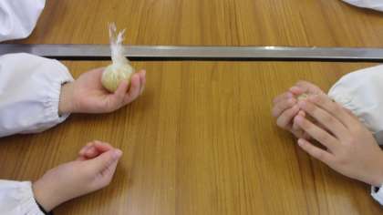 おいもを細かくつぶしてから、ラップに包んで一人一人丸めました。