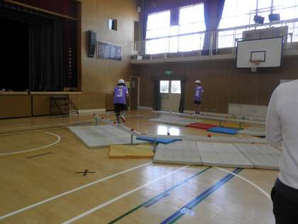 体育の学習で、体つくり運動をテーマに「田中道場をつくろう」という題で授業が進められました。子どもたちは、4つのグループに分かれてさまざまな体つくり運動を工夫しながら行いました。