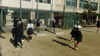 天気のいい昼休みです。最近「なわとび」をする子どもが増えてきました。ジャンピングボードを利用して、三重跳びをする子もいます。いろいろな技に挑戦して、たくさんとべるようになるといいですね。