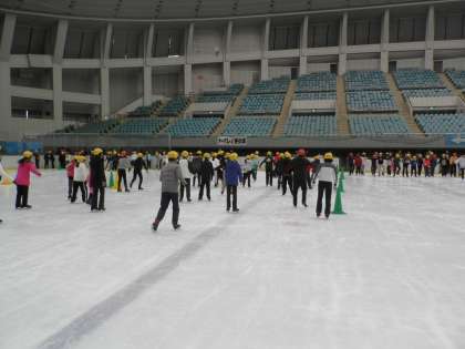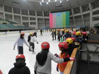 今日は、田中小学校の隣にある大阪プールのスケートリンクで、アイススケートの体験学習をおこないました。田中小学校では、運営に関する計画に八幡屋スポーツパークセンターの施設を利用した取り組みについて記載していますが、校長戦略予算で今日と来年の1月に2回で全部で3回アイススケートの体験を行います。1回目の今日は、3〜6年生がアイススケート体験をしました。講師の先生から、滑り方のコツを教えてもらい、たくさんの子どもたちがすいすい滑っていました。