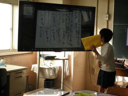 友だちと一緒に一つの詩を作り、最後には、タブレットと大型テレビを使って、発表をしました。