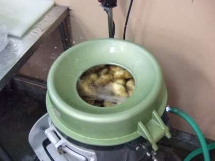 自動の皮むき器のなかで、皮がむかれていきます。