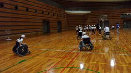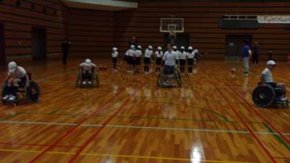 実際に競技用の車いすに乗って、前や横に進んだり、ドリブルをしたり、シュートをしたりしました。なかなかはじめは難しくて、うまくいきませんでしたが、慣れてくるとシュートを入れる子もでてきました。