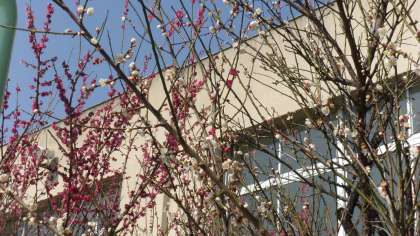 学校の紅白の梅の花が咲き始めています。校歌にも出てくる花なので、印象深いです。いつのまにか春が来ている感じですね。