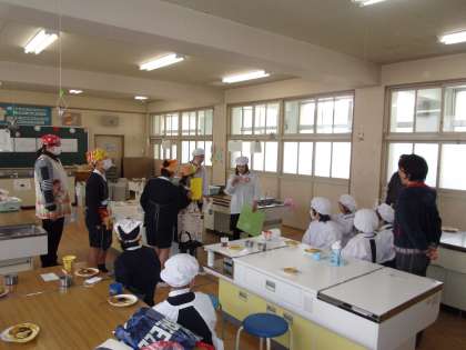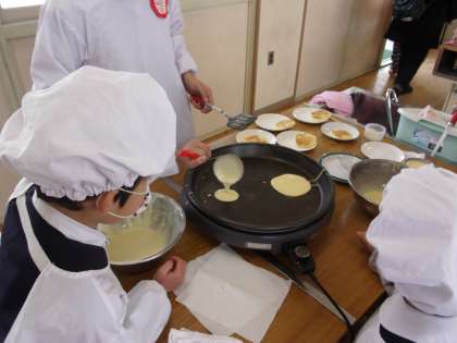 1年間、企画や司会を務めた6年生に感謝の気持ちを込めて、お祝いの言葉を伝えました。そして、みんなで一緒にホットケーキを作って食べました。