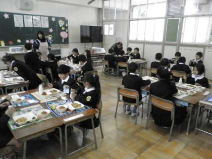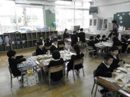 1年生が、小学校ではじめての給食を食べました。