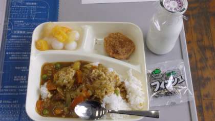 今日のこんだてはカツカレーライス、フルーツ白玉、ミニフィッシュ、牛乳です。