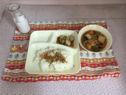 今日の献立は焼き鳥、豚肉とあつあげの煮物、紅鮭そぼろ。ごはん。牛乳です。