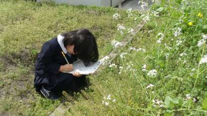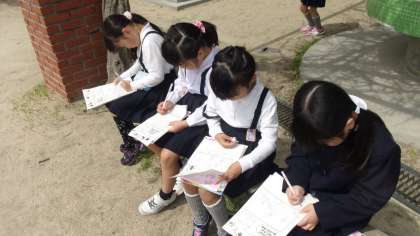 2年生が「春みつけ」で、花や虫などをワークシートにかいています。