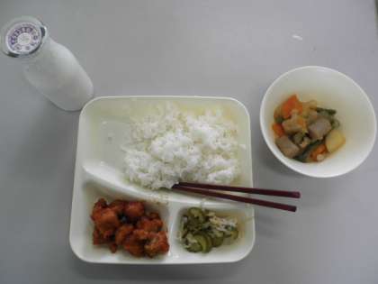 マグロのオーロラ煮、じゃがいもと野菜の含め煮、キュウリともやしのゆずの香あえ、ごはん、ぎゅうにゅうです。