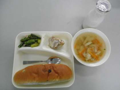 かつおのガーリックマヨネーズ焼き、スープ、グリーンアスパラガスのソテー、レーズンパン、牛乳