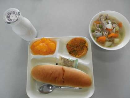 豚肉と野菜のスープ煮、変わりピザ、みかん(缶)、コッペパン、牛乳
