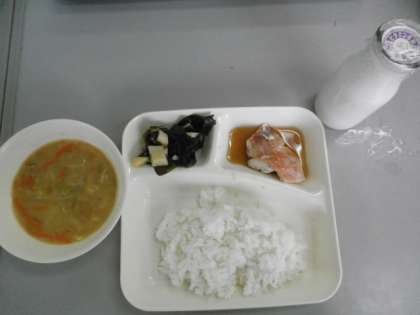 赤魚のしょうゆだれかけ、みそ汁、わかたけ煮、ごはん、牛乳