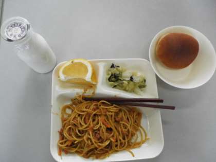 カレースパゲティ、キャベツのひじきドレッシング、かわちばんかん、黒糖クレセントパン、牛乳