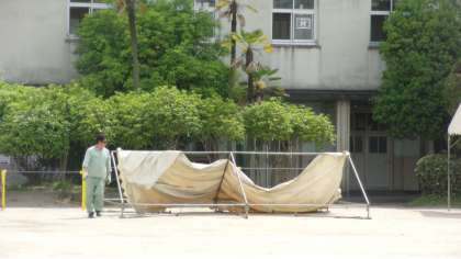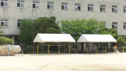 今日から運動会の練習が始まりました。暑さと熱中症対策のために、管理作業員さんにテントを立ててもらいました。有効に活用してくださいね。