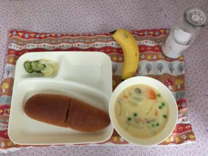 コーンクリームシチュー、グリーンサラダ、バナナ、黒糖パン、牛乳