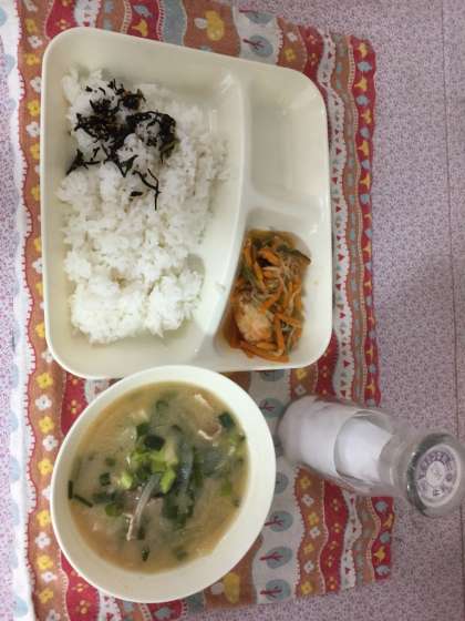 さけの野菜たっぷりあんかけ、みそ汁、まぜまぜふりかけ、ごはん、牛乳