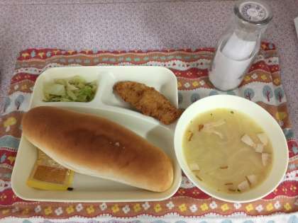 サーモンフライ、コーンスープ、キャベツのソテー、コッペパン、アプリコットジャム、牛乳