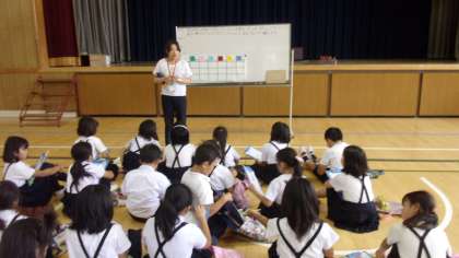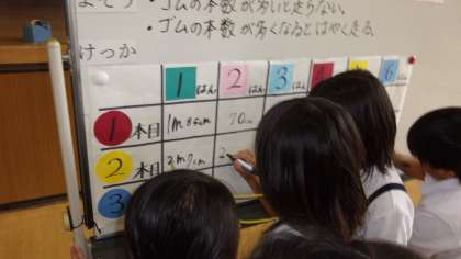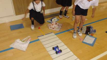 3年2組の吉村先生が理科の研究授業を行いました。輪ゴムの本数を増やすと、車の動きがどうなるかを調べる学習です。体育館に、5mまで測れる紙をひいて実験をしました。